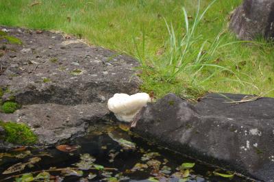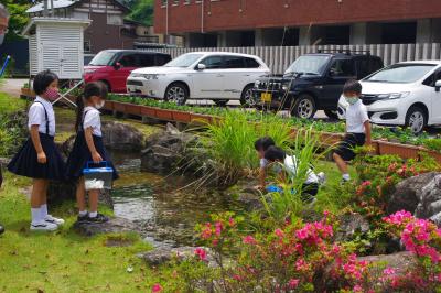 理科 モリアオガエルの卵を観察しています。学校の池に卵を毎年産みます。おたまじゃくしに成長すると、重力で池に落るような位置に、泡で包んだ卵を産んでいます。