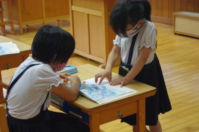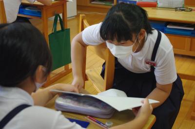 道徳 図工の時間に困っているノンちゃんを手伝ってあげようという親切心から絵の色ぬりする「親切とおせっかい」というお話を通して、「本当の親切」について、考えています。