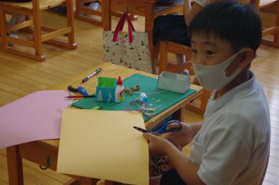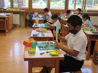図工 いろいろな大きさの箱を組み合わせて作品を作ります。