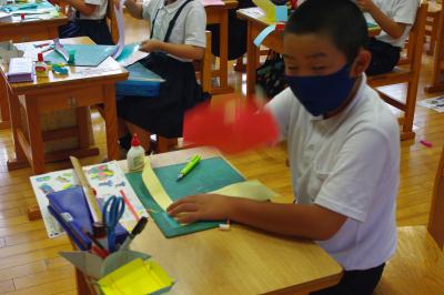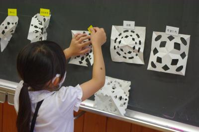 図工 紙を折ってはさみで切って、作品を作っています。