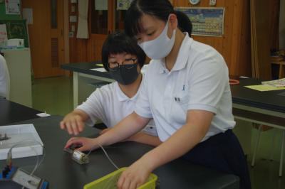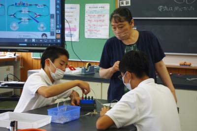理科 豆電球とLEDを使って、回路に流れる電流を調べています。