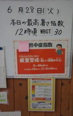 熱中症を予防するため、その日の暑さ指数を職員室に掲示し、職員が指数に応じた対応をするようにしています。