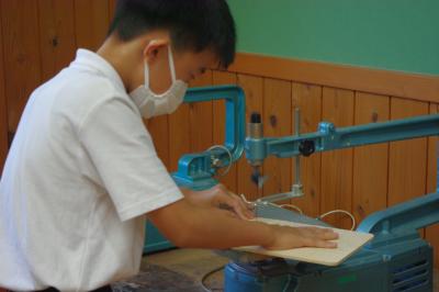 糸のこをつかって曲線を切っています。しっかりと押さえて慎重に取り組んでいます。