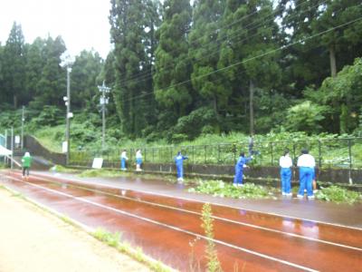 育友会行事の資源回収と愛校作業を行っています。前日に激しい雨が降っていましたが、開催直前に晴れ、草刈りを行っています。
