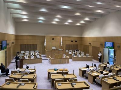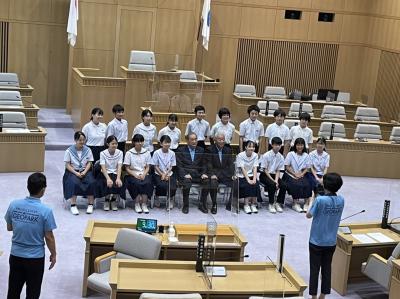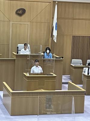 8月21日(日)白山市議会会場にて、市内の中学生17名が、地域発展に向けた政策について市議会の一般質問と同じ形式で意見交換するはくさん市子ども会議に、本校代表生徒2名も参加しています。