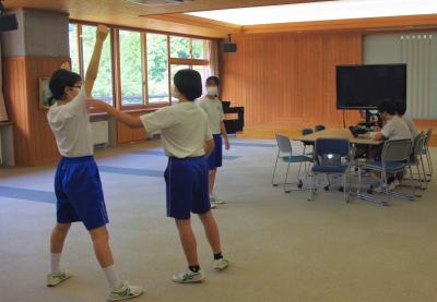 9月に行う運動会応援合戦の準備をしています。小中合同で応援合戦を行うため、小学生も表現できる動きを考えています。