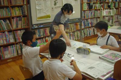 図書館の図鑑などを使って調べる方法を学校司書の先生からも学んでいます。聞いたことのない虫や植物を実際に図鑑で検索しています。