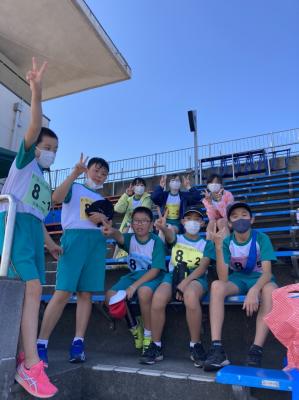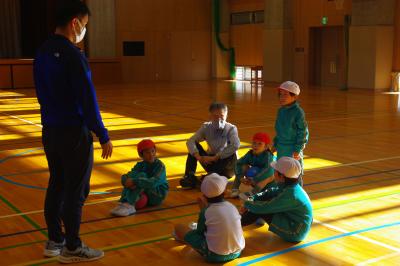 体育 ゲーム前にチームに分かれてウォーミングアップ。円陣になって声を掛け合います。「○○、ナイス!」「任せろ!」「オッケー」 よい雰囲気です。