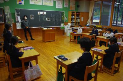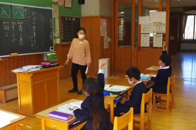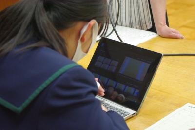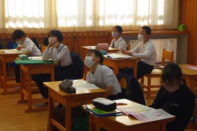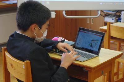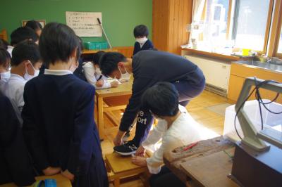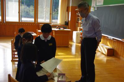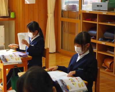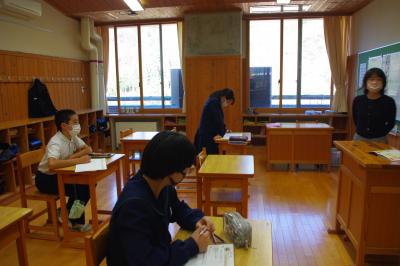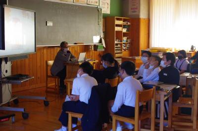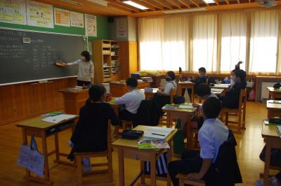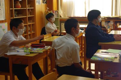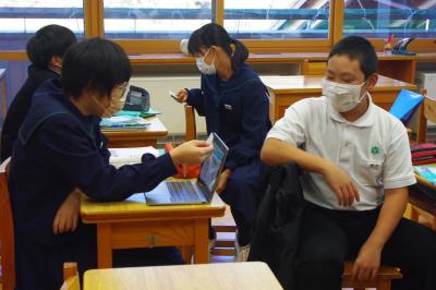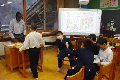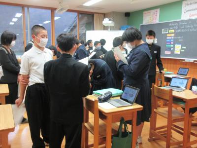 英語 「国際交流イベントで何がしたい」という課題で、白山市の国際交流イベント情報を見て、相手が何をしたいのか、聞いたり答えたり熱心に取り組んでいます。金沢教育事務所から指導主事を招聘し、小中の教員が授業を参観し学びました。