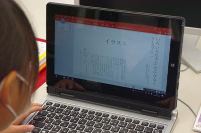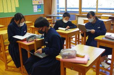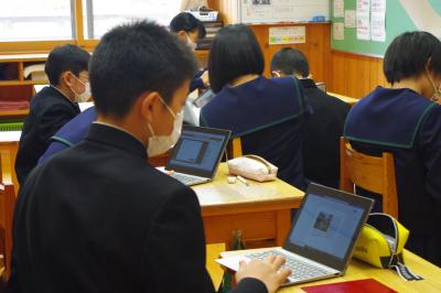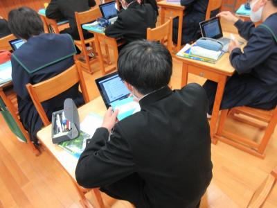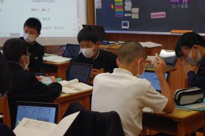 英語 学習者用デジタル教科書を使って自分のペースで音読したり、ペアでゲームを取り入れて音読したりしています。白山市の中学校では英語科学習者用デジタル教科書が配布されており、本校でも活用しています。