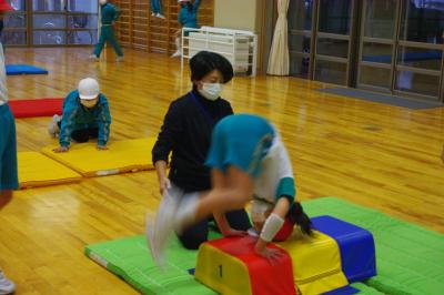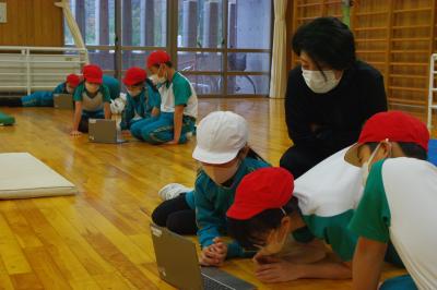 生活 作ったおもちゃで遊んでいます。遠くまで転がるのは誰のおもちゃかな。