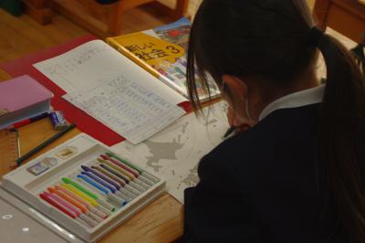 社会 カナダ極北地域で生活するイヌイットの暮らしの変化を調べています。かつては犬ぞりで漁業、テント生活で、魚やアザラシやカリブーを食べていましたが、現在はスノーモービルで漁業、電気や暖房のある家に暮らし、パンを食べるようになったという変化を教科書や資料集を通して調べて発表しています。