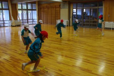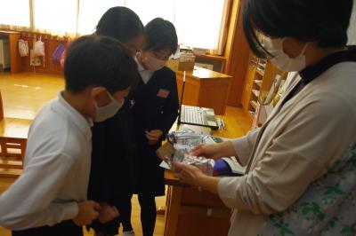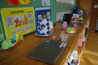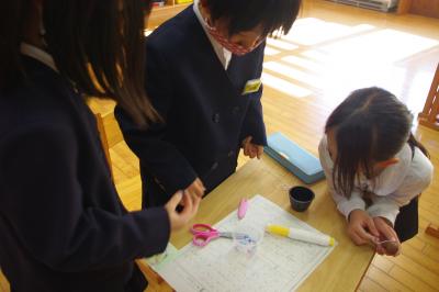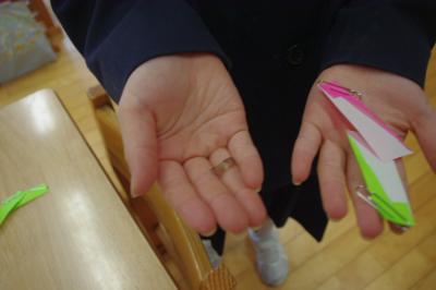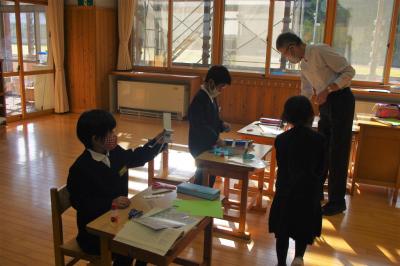 国語 吉野保育所との交流で紹介する手作りおもちゃがたくさん出来上がっています。投げたおもちゃがしっかり回転しながら落ちるか、試しています。また、新たなおもちゃとして、松ぼっくりと紙コップでけん玉を作ります。