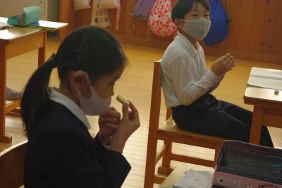 社会 学校での防災備蓄については既に学習を終えており、今回は市の備えについて学んでいます。実際の防災食である「ビスコ」を試食しています。味は普段と変わらずおいしいそうです。