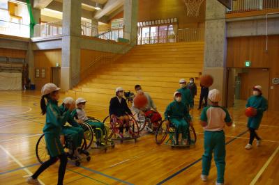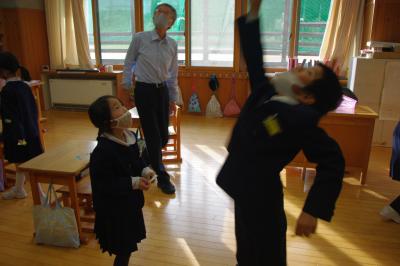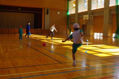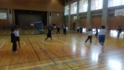 3限目と4限目の間の休み時間に、高学年と中学生がドッチボールを行っています。遅れて体育館にやって来た人も、その都度どちらかのチームに入って、和気あいあい、楽しそうです。小中併設校ならではの風景です。