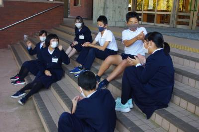 昼休みに白嶺交流集会を行っています。小中学生が一緒に集まり、生徒会委員会を中心に報告や楽しい交流ゲームを定期的に行っています。今日は、生徒会からは緑の募金で集まったお金の合計報告などの後、小中合同でフルーツバスケットというゲームを行っています。小学校1年生から中学校3年生までが、わいわいと楽しんで交流するのは、本校ならではの風景です。