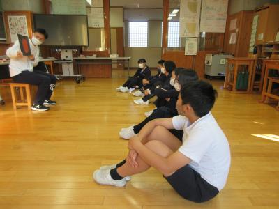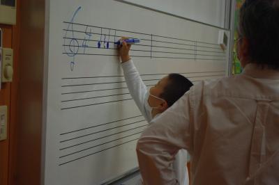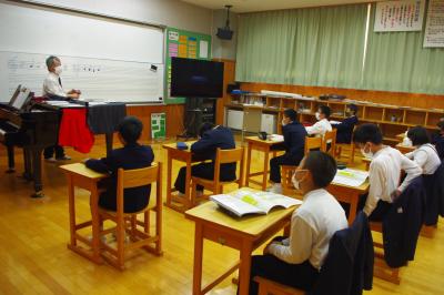 音楽 リラックスして声を出すことや息継ぎなど、歌うポイントを確認しています。この後、歌のテストを行います。