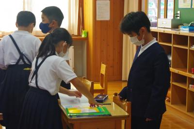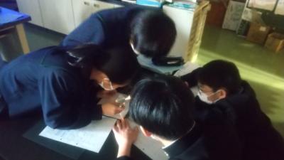学級活動 より良い結果を生み出すための話し合いの方法について、グループエンカウンターを通して学んでいます。あるミッションに対し、自分の意見も、相手の意見も大切にしながら合意形成を目指しています。皆、真剣に丁寧に話し合っています。
