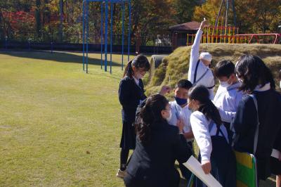 外国語 チャールズ先生と英語を使って学校林に散歩に行きます。