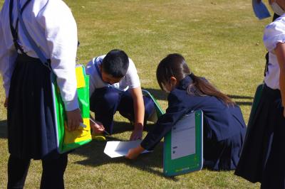 理科 日向と日陰を比較しています。温度や土の湿り具合を観察します。