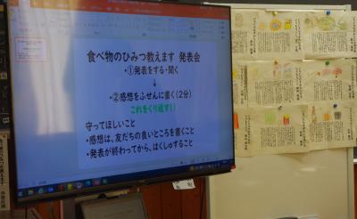 国語 各自が調べてきた食べ物のひみつについて発表し、発表を聞いた感想を付箋に書くなどの意見交流も行っています。