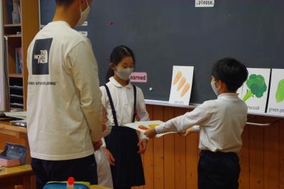 外国語活動 「何がほしい?」「これ」「はいどうぞ」「ありがとう」のやりとりを英語で行っています。
