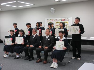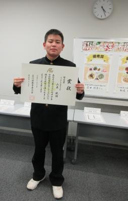 11月18日に行われた中学生学校給食献立コンクールの様子をお知らせします。本校中学校3年生徒が努力賞を受賞し、県庁にて表彰されています。
