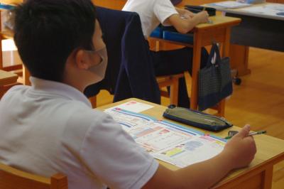 国語 物語文「プラタナスの木」を通して、場面ごとの出来事を的確に読み取ることを学んでいます。4年生も「全文シート」を使って、物語全体の動きを捉えようとしています。