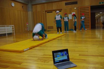 体育 開脚前転を仕上げるために、端末で自身を撮影し、修正箇所を確認しています。