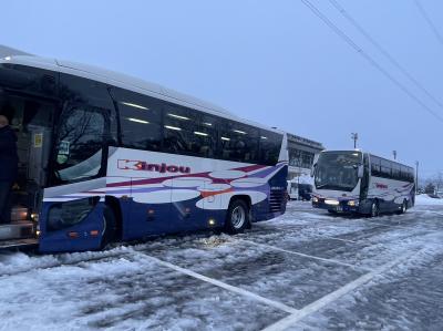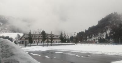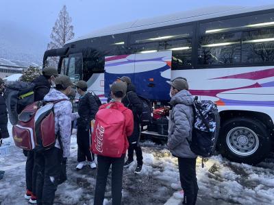 中学校のアルペンスキー部とクロスカントリースキー部は、白峰の競技場へ今日も練習に行きます。学校からスクールバスで30分ほどで到着します。午前中練習し、昼頃学校に戻り、学校から自宅のある各バス停にバスで帰ります。
