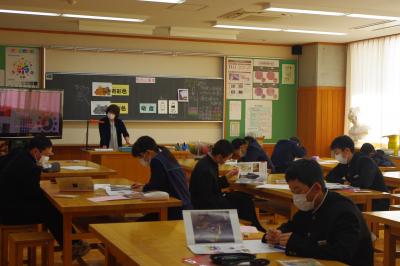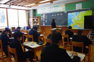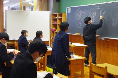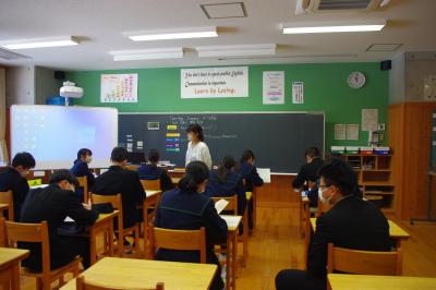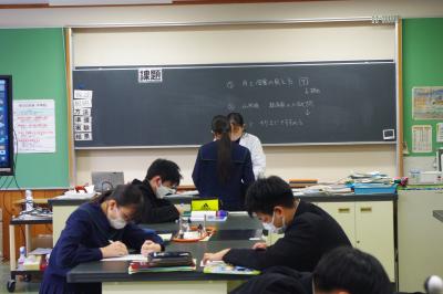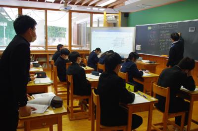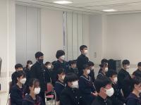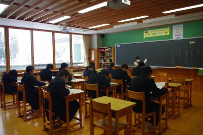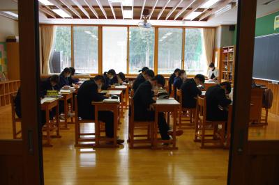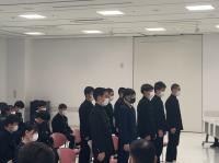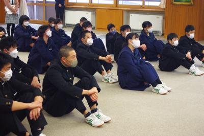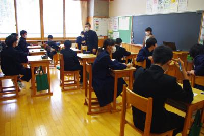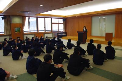 中学3年生は明日、私立入試です。試験に向けて進路担当の先生や担任の先生から前日や当日の過ごし方等のお話、校長先生から激励の言葉をもらっています。