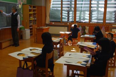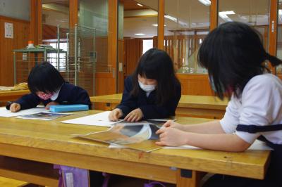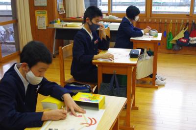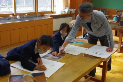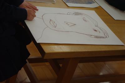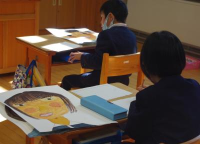 図工 6年生を送る会で披露する似顔絵を引き続き作成しています。誰の顔を描いているのでしょうか、お楽しみに。