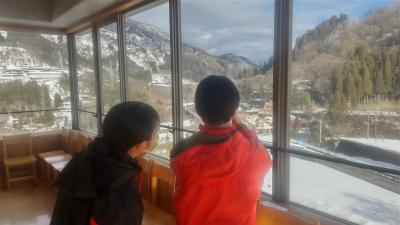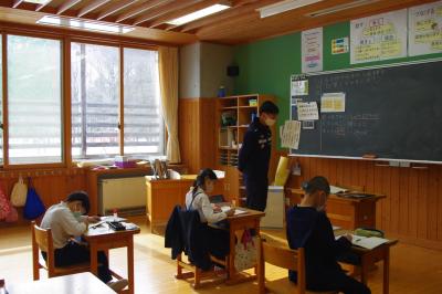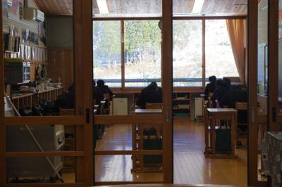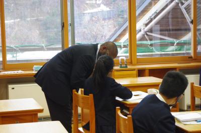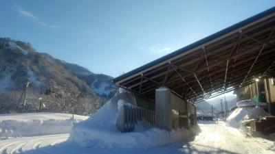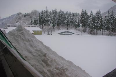 今日は雪が止み、学校から見える山々の景色がきれいです。うるま市の生徒が言っていた「最高の景色」という言葉を思い出します。学校の屋根雪が落ち、校舎周りに雪の壁ができています。雪の壁は高いところで校舎の2階に達しています。