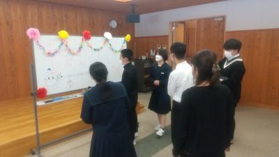 外国語 日本の遊びや行事について3つのヒントを使ってクイズを作っています。