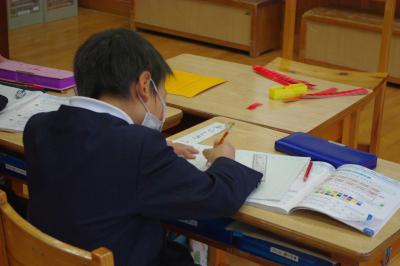 道徳 働くことについて考えを交流させています。外に遊びに行こうとしたら、母にみかん出しの仕事を手伝ってほしいと言われ、いやいや仕事をしていましたが、ふとしたことからみかんに色や形を見つけて、自分なりに楽しみながら仕事をし、あっという間に終わらせたというお話から、働くことについて考えています。