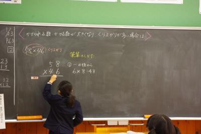 算数 かけられる数か3桁の筆算について学んでいます。間違えたことをいかして次の問題に取り組んでいます。
