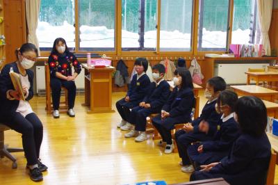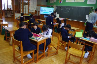 お話プレゼント 朝、各学年で先生が絵本の読み聞かせをする日です。高学年も楽しんで聞いています。