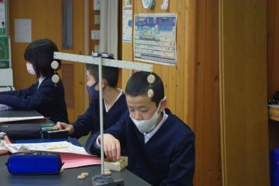 理科 釣り合いについて実験を通して考察しています。支点からの距離と重りの重さの関係に注目しています。