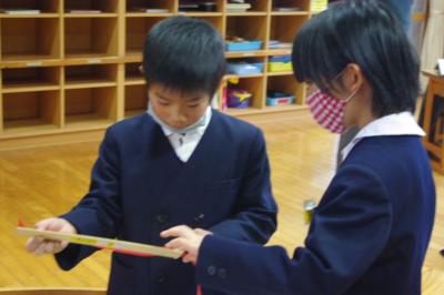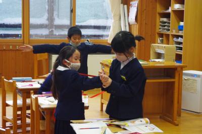 算数 自分の体の長さを測ってみています。その後、体にちなんだ文章問題に挑戦します。「○○さんが両手を広げた長さは、30cmものさし4つ分でした。○○さんが両手を広げた長さは?」