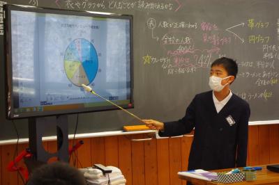 算数 円グラフの数値の読み取り方について意見を交流させています。