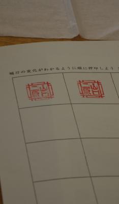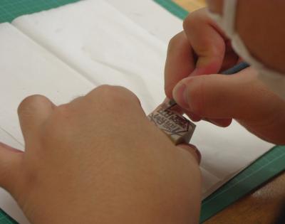 美術 篆刻 名前を古い書体で石に転写し、彫刻刀で彫ります。仕上がった作品が素晴らしいと先生に褒められています。