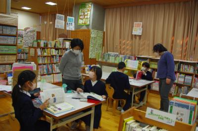 図書室の司書の先生と一緒に百科事典を使った学習を行っています。