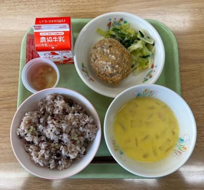 今日の給食は「中学生学校給食献立コンクール」で入賞した本校中学3年生が作ったメニューです。さつまいもと栗の入った赤飯やジビエ肉コロッケ、いちじくゼリーなど、地元の食材を使ったメニューです。