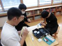 2年生 家庭科 「ハンドピロー」を手縫いで作っています。