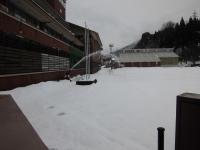 屋根から落ちた雪を除雪しています。雪がもっと積もれば、グラウンドにクロスカントリースキー練習用のコースを作ります。