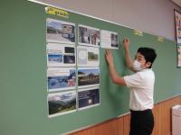 1年生 英語 「自分たちの住んでいる地域が、どのようになったらよりよく生活できるようになるか」を考え、英語と写真やイラストなどでまとめたものを掲示しています。