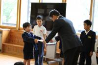 1年 生活科 桜餅を作りました。校長先生にお届けです。