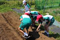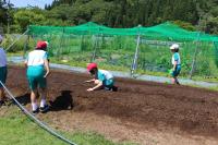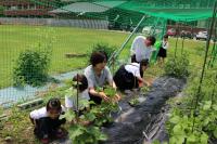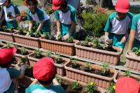 〈小学校〉「福島ひまわり里親プロジェクト」 発芽したひまわりを畑の横の花壇に移植して、残りの種もまきました。