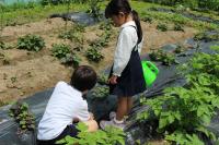 1年 生活科 学校の畑で育てている野菜の水やりや草取りをして、生長を観察をしました。小さなキュウリの実がなっています。