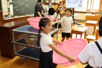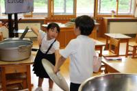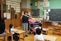 1年 生活科 「給食室のひみつ」大きな鍋やざる、木べらなどに興味津々。